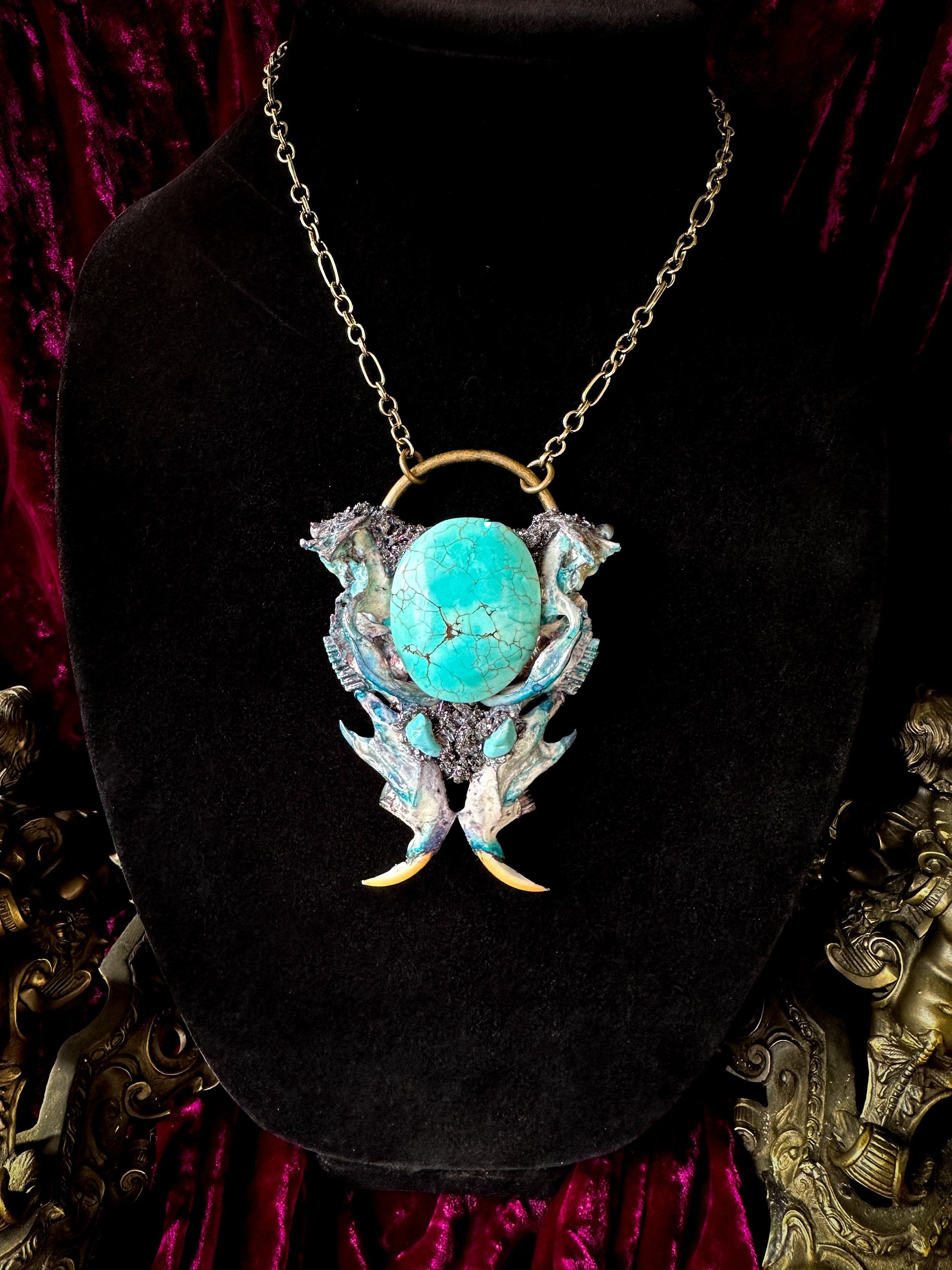 Magnasite, Turquoise, and Carborundum - Crystallized Bisected Muskrat Skull Necklace.