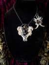 This beautiful pendant and matching earring set was made from a single Muskrat skull. The skull was stained, bisected, attached to a black matte metal ring and chain and fastened together with hand dyed amethyst and carborundum. The jaw bones were stained, crystallized and attached to silver plated hooks.