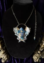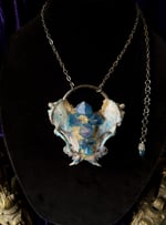 This Crystallized Bisected Mink Skull Necklace and Earrings Set captivates with ethereal beauty. Crafted from a single mink skull, the pendant is bisected and mounted on a gunmetal ring and chain, then adorned with hand-dyed blue amethyst and sparkling smoky quartz sand, creating a shimmering glow that seems touched by moonlight.