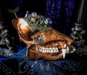 This copper javelina skull would look lovely displayed in any Steampunk living quarters. He has a very unique bronze watch affixed to his skull along with it’s chain which is wrapped between copper colored pyrite cubes. Large, clear quartz, crystals decorate its crown along with a copper butterfly winder.
