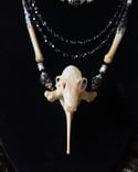 A stunning layered necklace strung with real coyote foot bones with filigree bead caps, black Czech glass rondels, bone beads, black rosary chain, gunmetal black rhinestone beads ornate silver plated spacer beads, with an adorable fruit bat skull which is affixed to a large sheep vertebra.