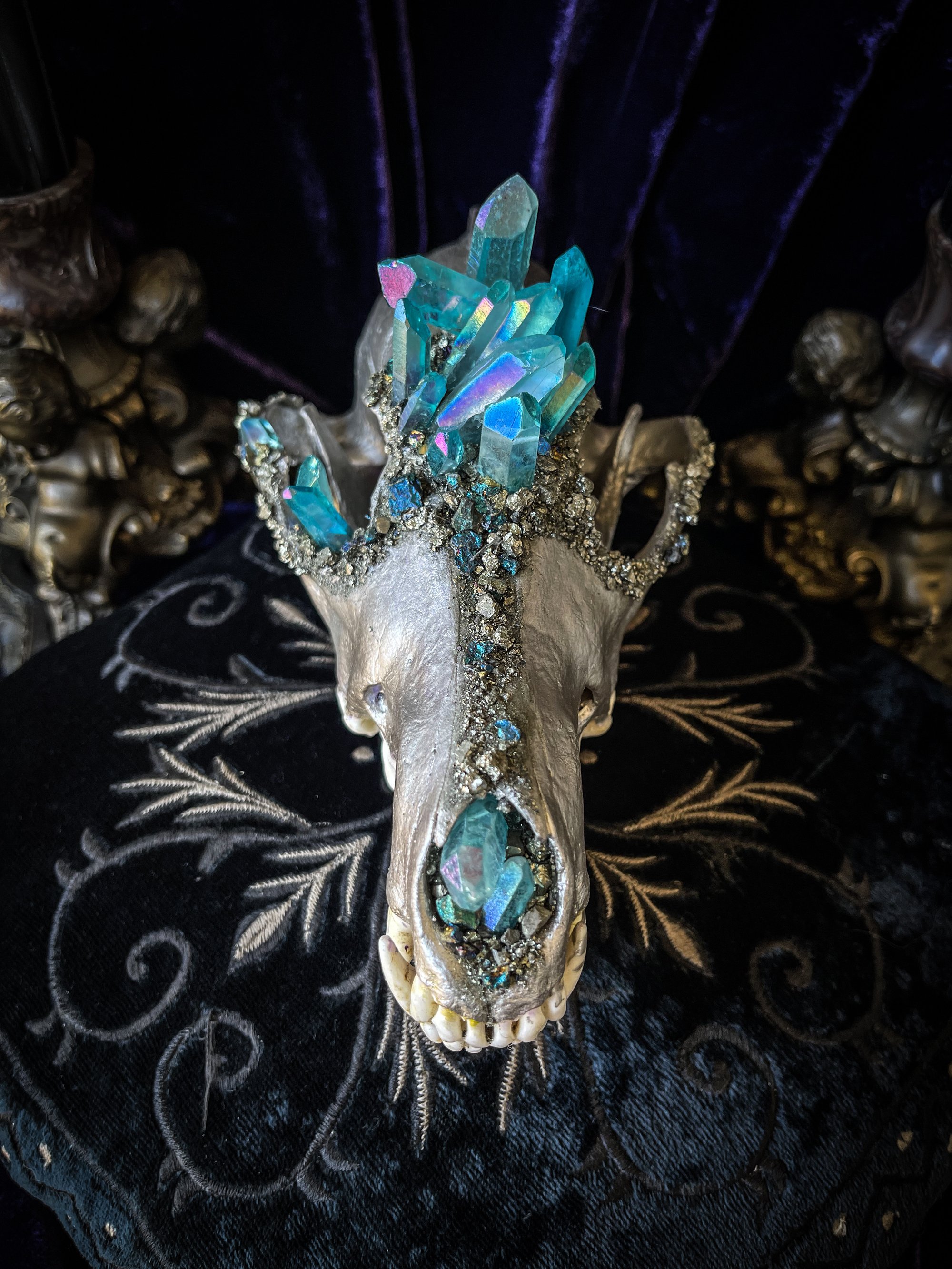 Invite clarity, protection, and intuitive guidance into your space with this encrusted coyote skull. Professionally cleaned and hand-painted with silver metallic paint, it is adorned with light blue aura quartz, pyrite, and chalcopyrite, each crystal chosen to amplify energy, inspire insight, and bring a touch of luminous beauty. Finished with a protective resin coating, this piece combines natural strength and symbolic meaning in a stunning display.