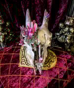 This stunning goat skull has been professionally cleaned and hand-painted in radiant rose gold, creating a warm, luminous base. It is encrusted with pink aura quartz and pink tourmaline crystals, then sealed with a protective resin coating to preserve its sparkle and intricate detail.